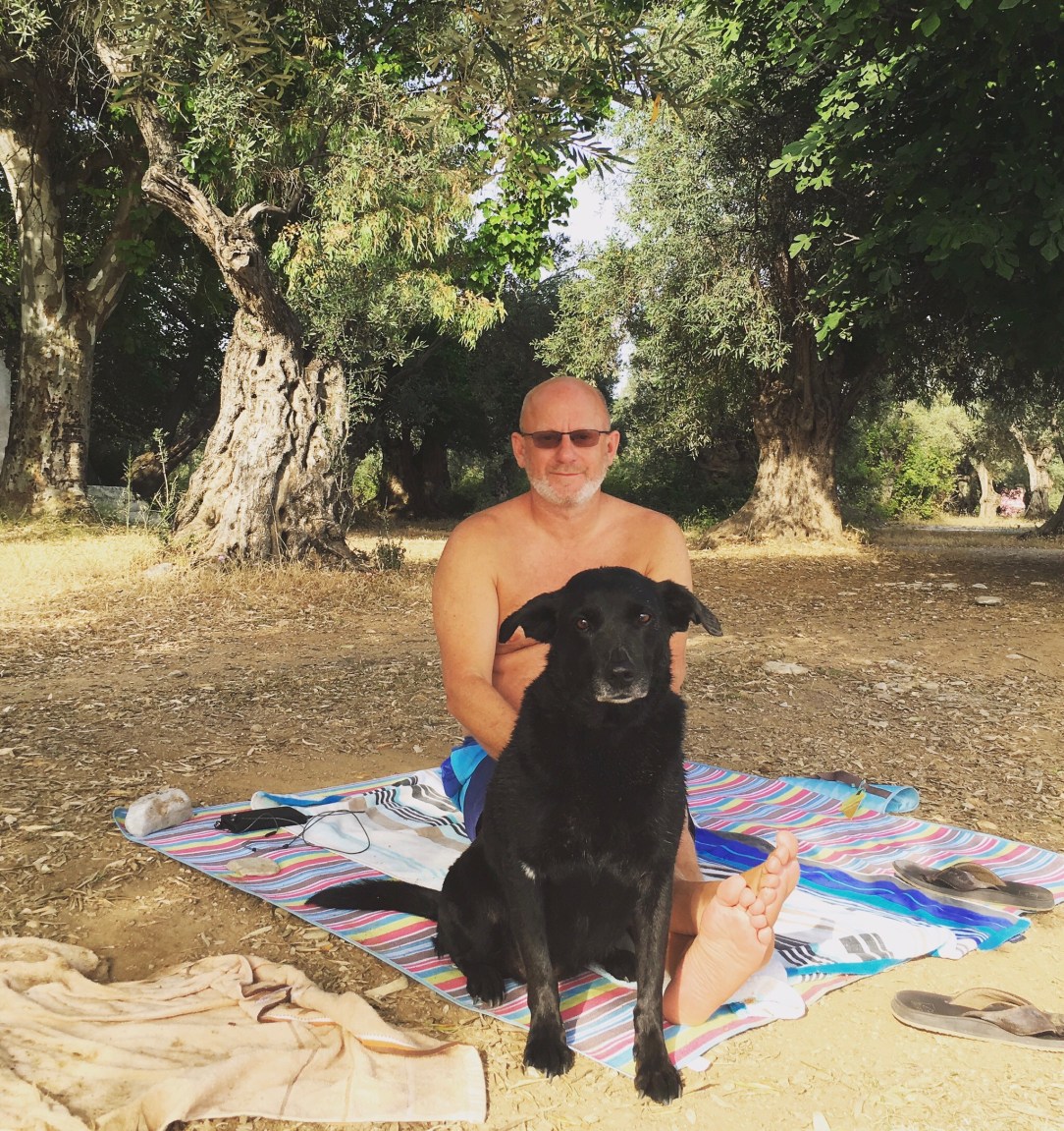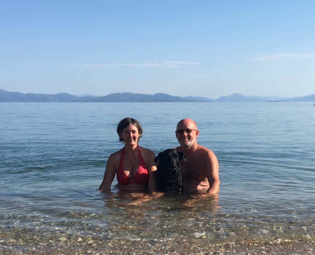 Within walking distance of where we stayed, was a long pebble beach that was near deserted most days and the three of us would spend the afternoons trying to keep cool in the shade and swimming in the sea. David took his hammock and set it up shading himself between two olive trees. We have never seen Chloe swim as much as she did here. You have to throw the ball and she swims out, retrieves the ball and this goes on until she is exhausted. For a dog that is nearly 12 years old it is a joy to see. She will miss the sea when we leave and so will we. On the last day we all went to the beach for our last swim together and the sea was so flat, we had the most wonderful time. A memory to last a lifetime.