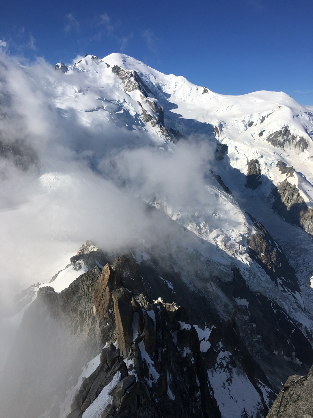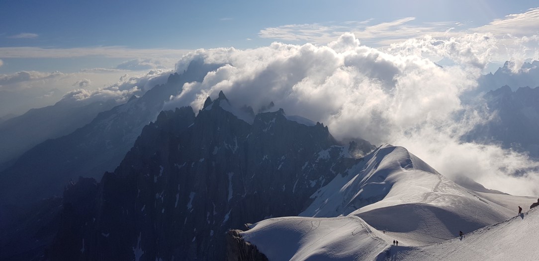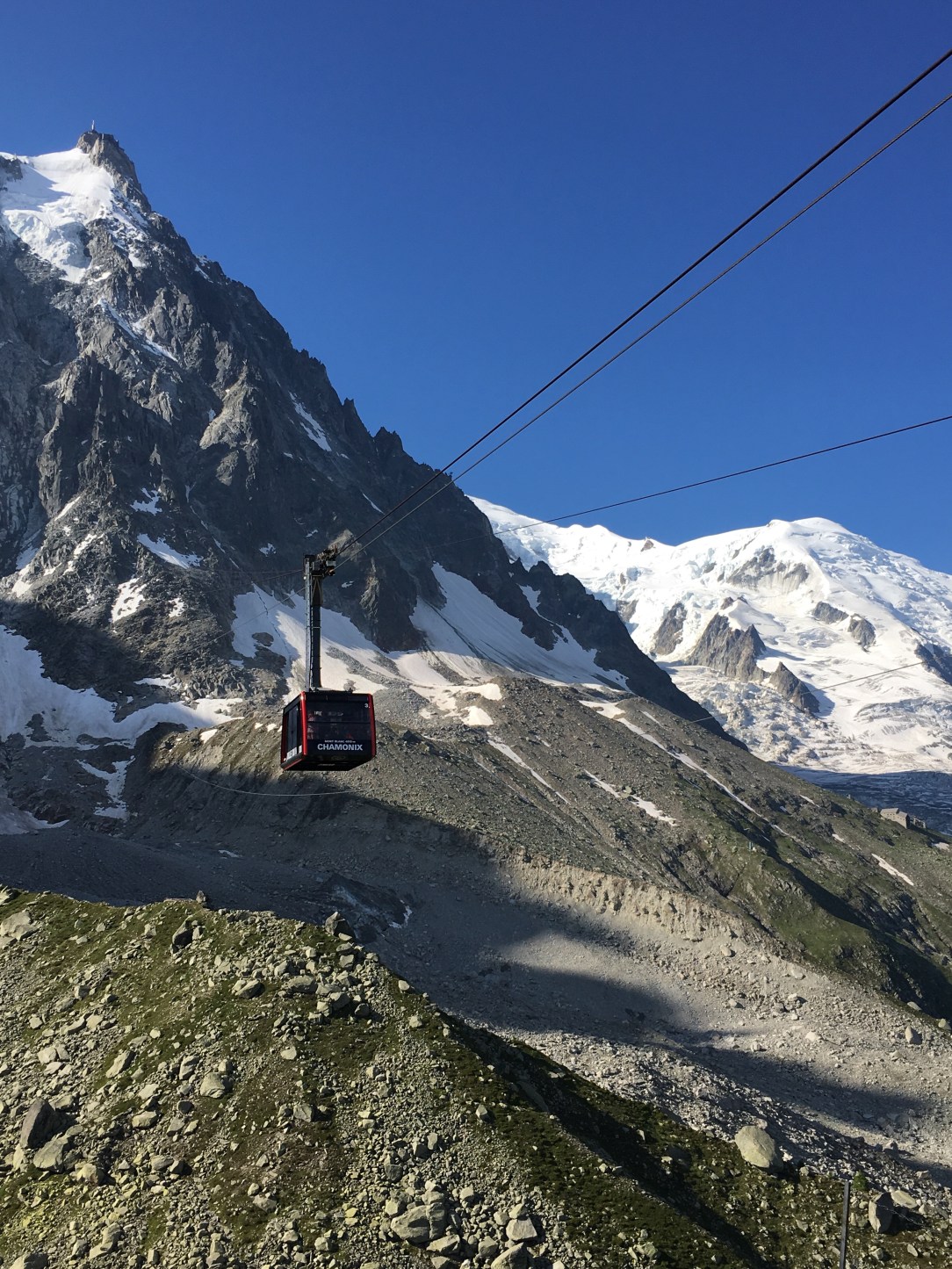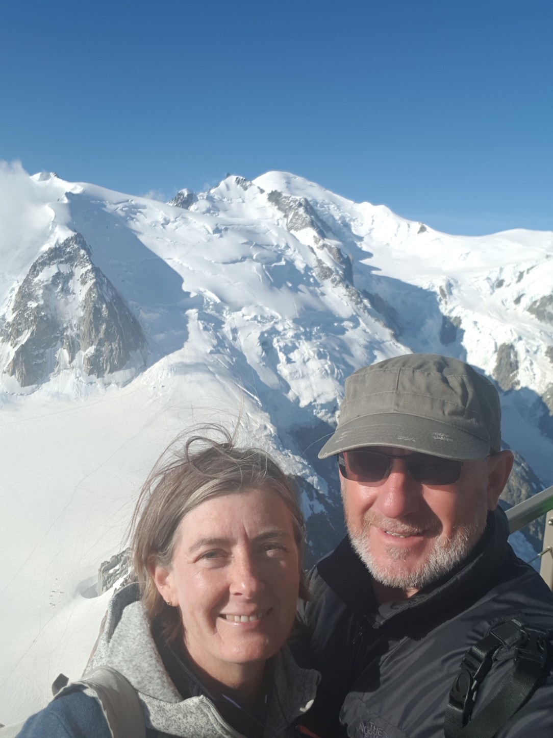 Our destination was a campsite just outside Chamonix, but as we were following our ‘Snooper’ Sat Nav which knows our size and weight of the van, it brought us to a bridge under a railway line that was too tight to get through. Not all that good after all ! The roads in this part of France are very small and very windy and we decided to park for the evening in Chamonix itself, as there are dedicated areas for Motorhomes. Now Chamonix is in it’s self an eye opener. It contains the most fit people we have ever seen in our lives, not an ounce of fat on them, all kitted out in their hiking gear. God, did we feel out of place. Obviously because of where it is, it is busy all year round and the Main Street is filled with hiking shops selling all the gear you would need to climb Mont Blanc. Unfortunately they didn’t sell new bodies which David & I would need and so we just window shopped. It is very beautiful and with the back drop of Mont Blanc you can see why people flock here. It is a sight to behold. After reading up about getting the cable car to the top of Mont Blanc as we were obviously not climbing it, we decided to get the cable car early the next morning to beat the crowds. We set the alarm and arrived at the cable car station for 07.00am. No queues, still all fit climbers with their ropes and clips, snow picks and snow shoes dangling off their rucksacks and David and I wrapped up in our winter clothes as the temperature can be a lot lower at the top of Mont Blanc. We packed into the cable car and we were off. It takes over 10 minutes to reach the first stage, Aiguille Du Midi, we were climbing and climbing and I can’t tell you the excitement, until the cable car suddenly seemed to drop and then climb again. Not sure why but it’s a long way down ! My heart jumped but I tried to remain cool, trying not to embarrass myself in front of the fit crowd. We made it to the first stage and we left the cable car to get the next to the top, another 10 minutes The view from Aiguille Du Midi at 3842M was amazing but when we finally reached the summit at 12,392ft, above the seracs, the Pelerins glacier and the hanging glaciers on the north face of the Aiguille du Midi, the view took our breathe away. It is such the most wonderful sight to see, how lucky were we to be standing there looking out at our most beautiful world. Words cannot describe the beauty. If you are not afraid of heights, try and get here in your lifetime because you will remember it as long as you live. We stayed for 2 hours in all and we did notice due to the altitude that we were slightly light headed and breathless, I bet the fit people weren’t. We had our photos taken in the glass box that overhangs the edge and then descended down the two cable cars to the bottom, just as the queues were beginning to build. For the rest of the day I had the biggest smile on my face, wow what a day to remember.