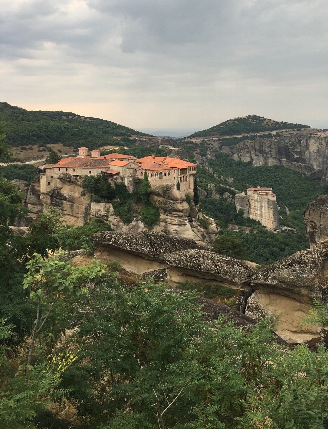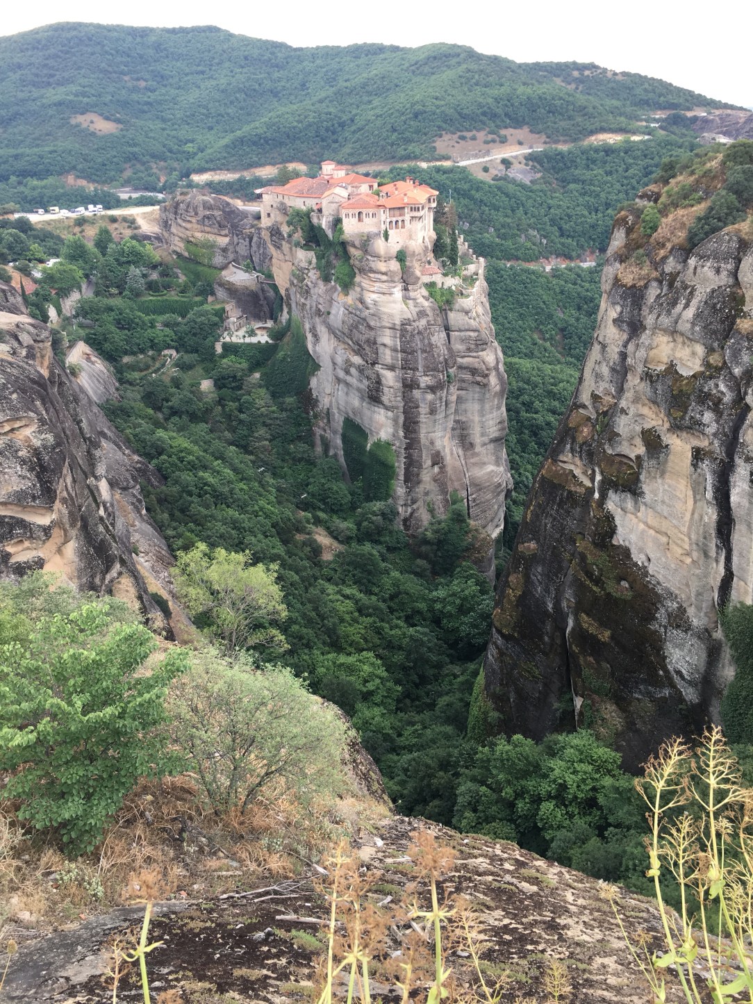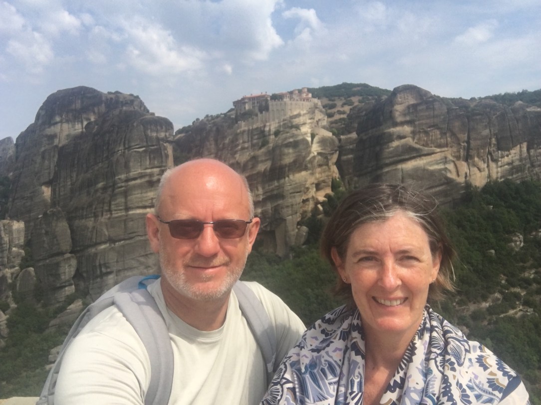 It was with a heavy heart that we started to make our drive west back to Ingoumenitsa where our Greek odyssey first started. On the way inland we stopped a couple of days at Meteora, which had been on our list to visit in Greece. The Meteora Monasteries rise in the centre of Greece where the Pinios river emerges from the deep canyons of the Pindus range. These gigantic rocks etched by time in a variety of shapes; great stalagmites rising towards the sky. The Monasteries with their wooden galleries and corniced rooftops, crown the summits of these formidable pinnacles. They we built 600 years ago by Byzantine monks to worship God, how they were built on these virtually inaccessible rocks is amazing. We stayed in the nearest village Kalambaka and decided to cycle the next day to the Monasteries, YES I did say cycle ! Our main concern every time we do something is Chloe and leaving her in the van. Therefore we set our alarm for a 06.45am wake up. David said he couldn’t remember the last time we got up so early. We thought we would cycle to the largest and most important of the Monasteries first The Great Meteoron. In older days the ascent to the Monastery was made by joined ladders and nets of baskets. Luckily now, one goes up a flight of 115 steps albeit irregular stairs cut into the rock face. Part of the reason to go early other than our concern for Chloe was the hordes of Japanese tourists that we learnt descend on the Monasteries by the coach load. We set off with plenty of water and luckily a slightly cloudy sky, David navigating with google maps. Suddenly, we start riding on a track and I have this vision of a shut gate at the other end as in Spain. No shut gate but the track turned into a 1:10 and there was no cycling just pushing our bikes up through huge rocks. Sweat pouring off me by the time I reached the end of the track, David says ‘maybe we should stick to the roads from now on’ ! Thank God for that I thought. I was also gutted as I lost my ‘Fitbit’ on the track. Anyway, we continued our climb on the nice smooth road and reached the first Great Meteoron just before 08.30am. Not a Japanese tourist in sight. Happy days I thought, unfortunately, our happiness soon evaporated as we saw the first coach come up the road, followed by another, then another and so it went on. By the time The Great Meteoron opened at 9am, there were 5 coaches of tourists. We made our way up the steps to the Monastery changing into trousers and me covering my shoulders as per the dress code and made our way in. It is lovely inside with the many valuable works of art, fine frescoes, rare books and intricate twelve sided dome. But unfortunately there were just too many people which spoilt it for us. We visited one other of the Monasteries as David said I am only doing 2 ! But to be honest, their beauty to us was in the landscape that they sat in. By cycling, this gave us the perfect vista and for us the best of Meteora.