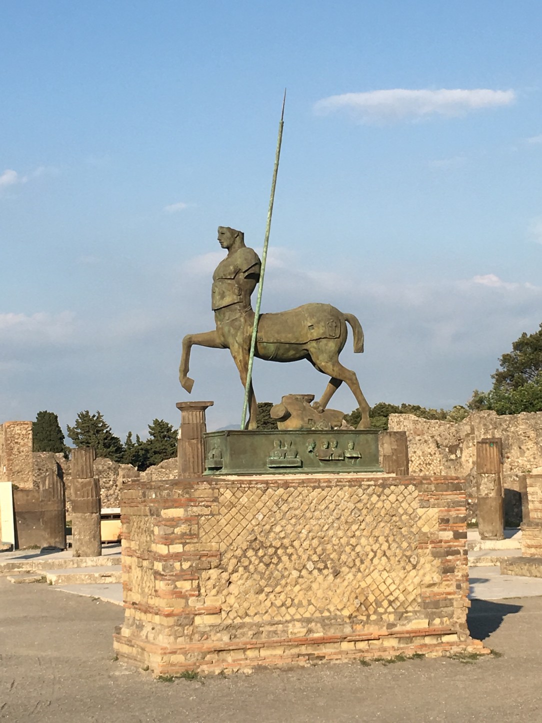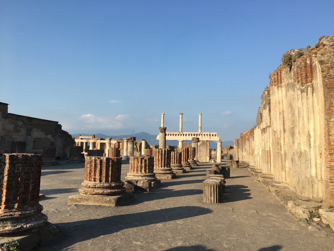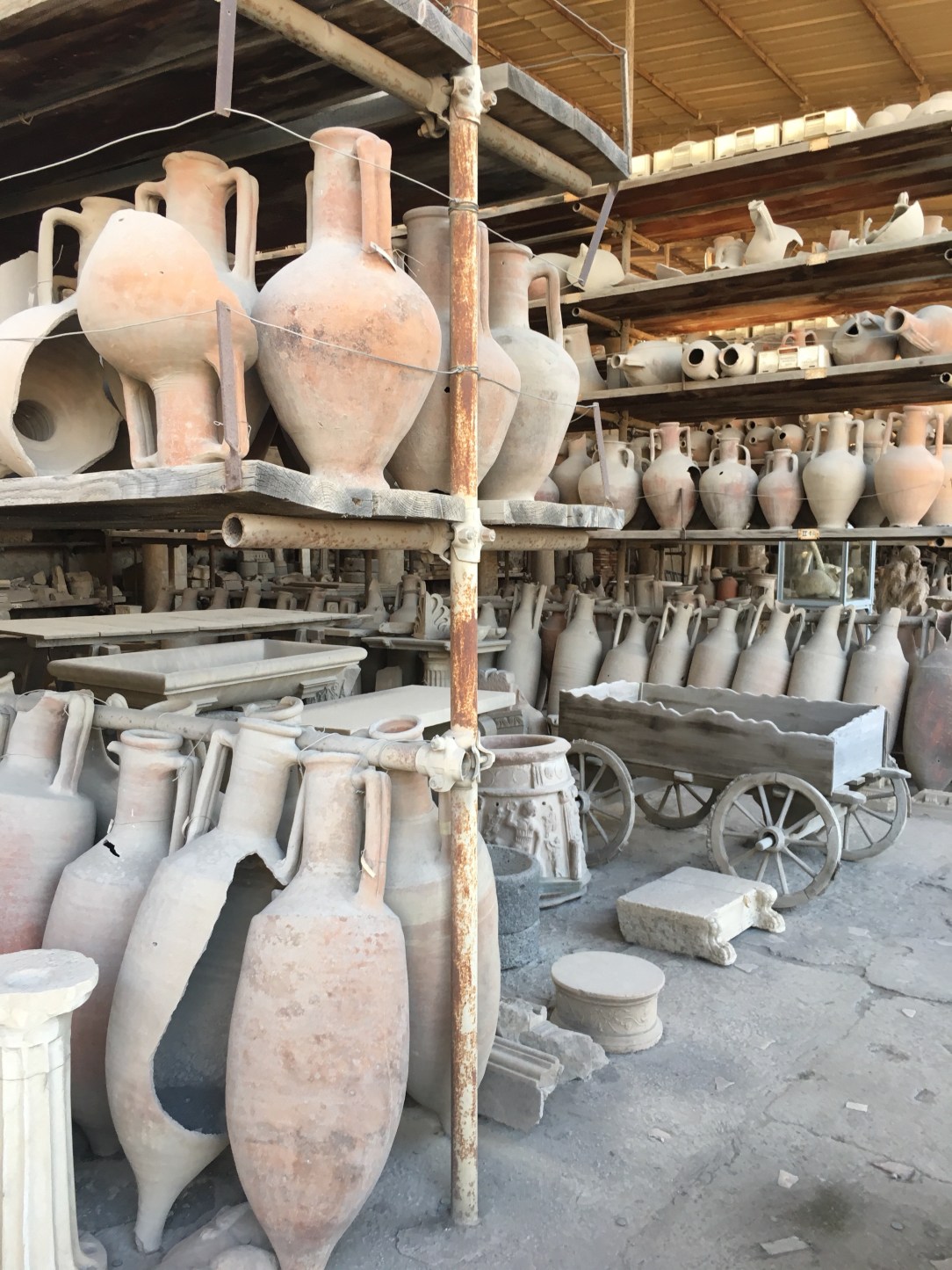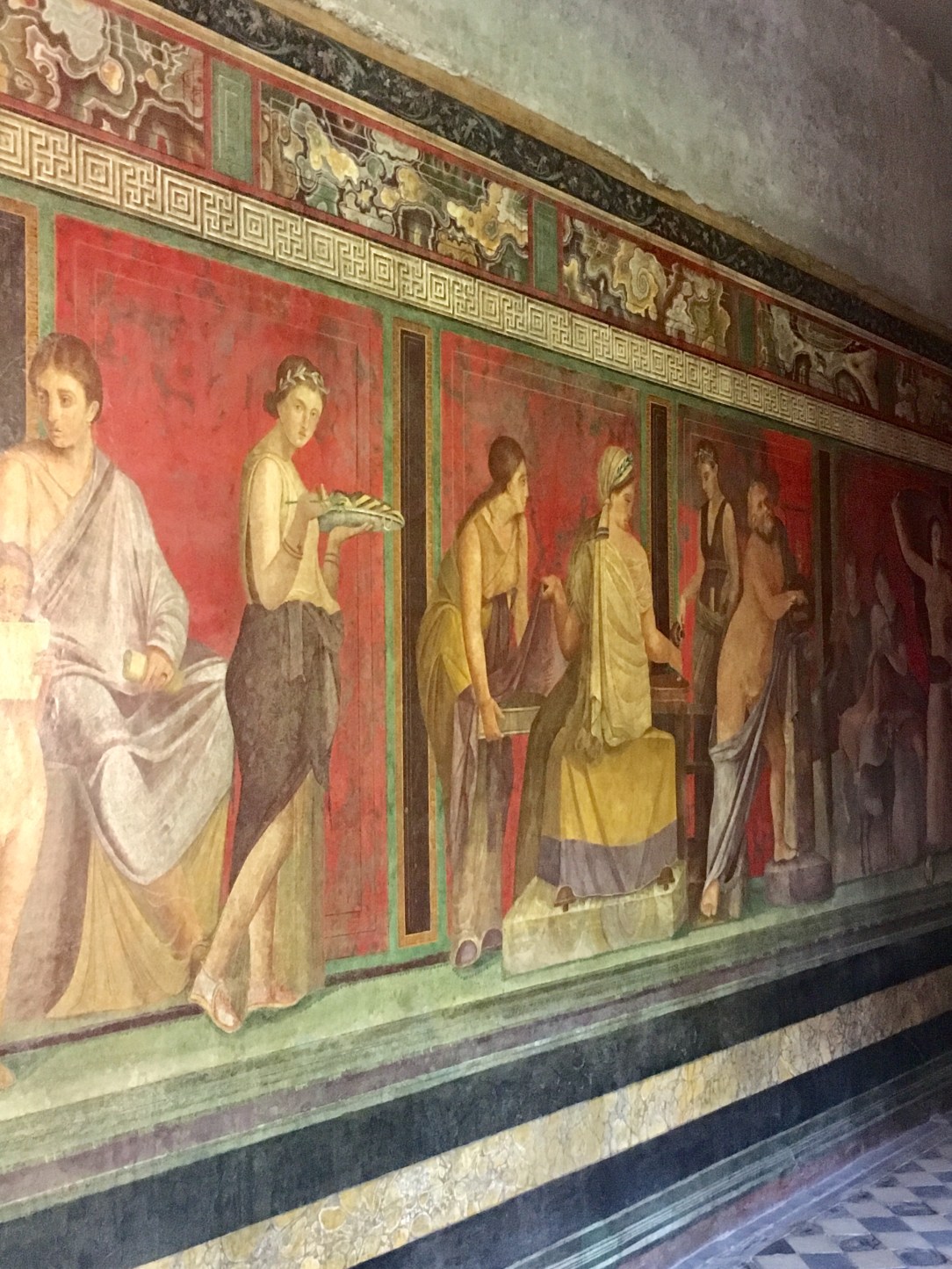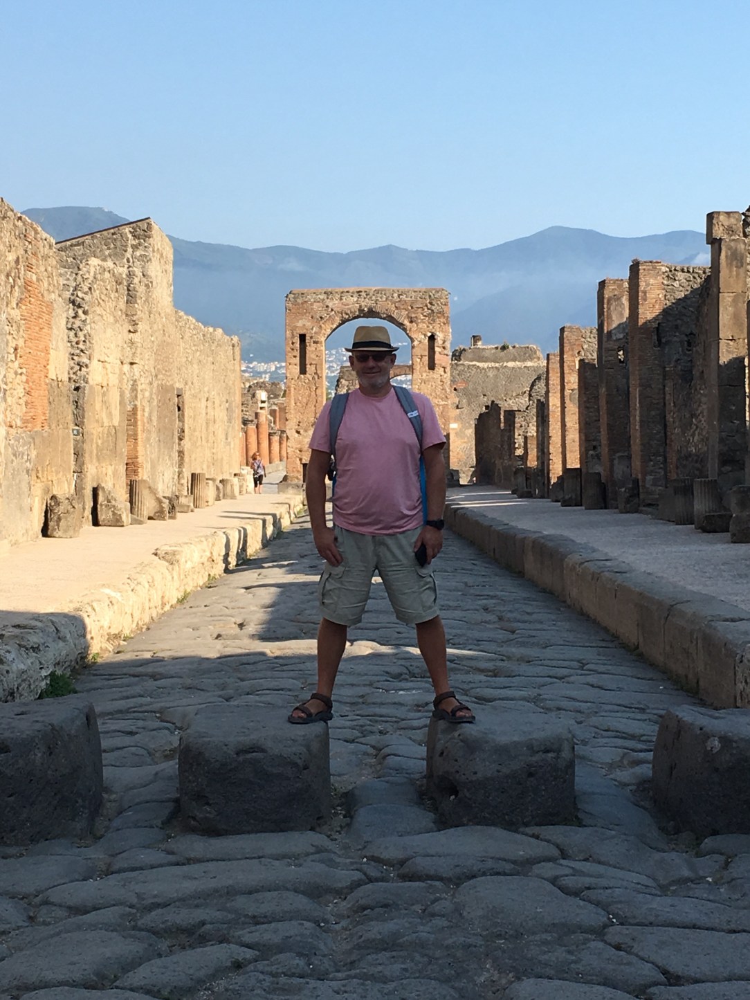 We visited Pompeii in the late afternoon and we were blown away with the amazing city before our eyes. The city was destroyed by Mount Vesuvius in AD79 and is quite rightly a UNESCO World Heritage Site. The preservation of the buildings, paintings, mosaics and structures gives you the feeling that you are walking in AD79. You could spend the whole day wandering the streets taking in the amazing sights from the ground surface which has small white square tiles called cat’s eyes, which the moon or candlelight illuminated so people could see where they were walking at night. The huge number of clay pots found intact, the track marks for the carriages for a smoother ride. The rich colours of the wall paintings and mosaic floors still intact. However, it is tinged with sadness as the whole city was destroyed. We both found it very humbling for over 1,900 years later to walk the same streets.