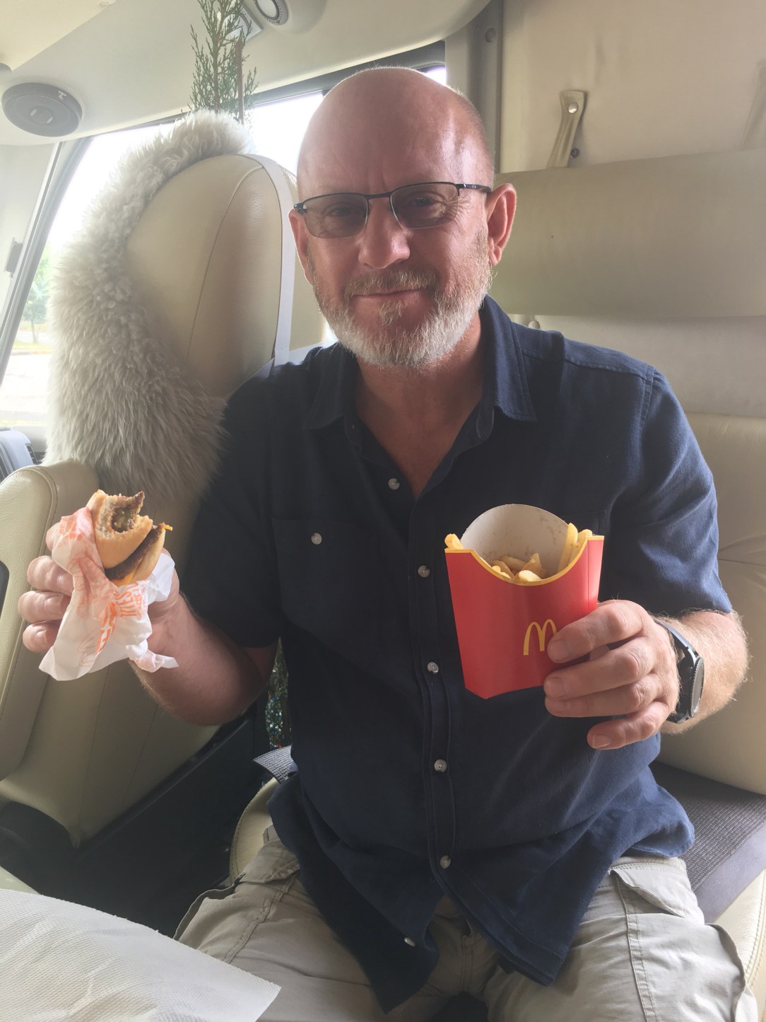 We found a pretty place to stop for a couple of days by a lake to recover from the vet’s fee and we were in complete shade so as the temperature was hitting 37 degrees we were able to cope. As we left to continued our travels North David suddenly said a ‘I fancy a McDonalds’. I said, if you could have one what would you have and he reeled off his Big Mac, Fries and a Milkshake. I said, that to be honest I was all baguette out and I quite fancy a cheeseburger myself ! Then out of the blue as if our prayers had been answered on the side of an old building I saw an advertisement for a McDonald’s, 7km away. We trundled on trying to remember the last time we had eaten a McDonald’s. Suddenly on the roundabout and being able to park close by we had our first burger in over 8 months, so we didn’t feel too bad !