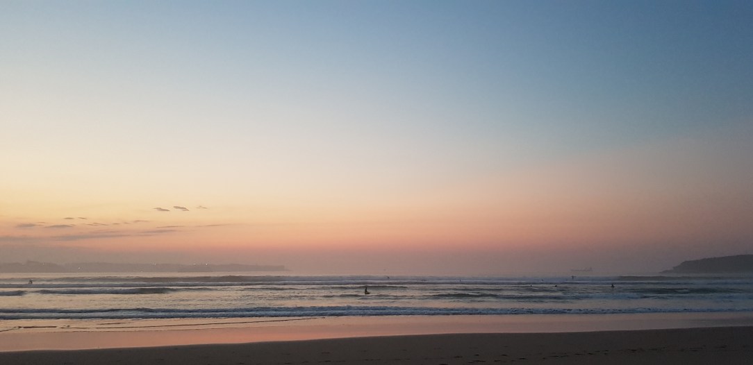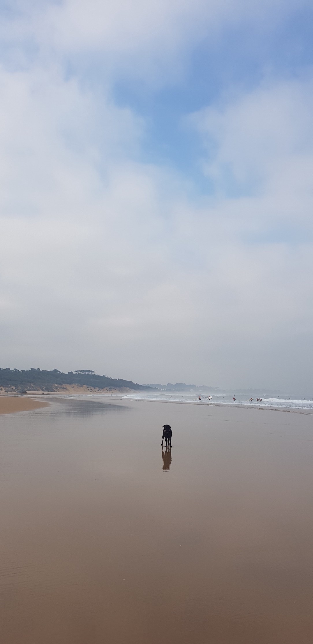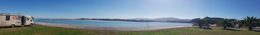 I am writing this sitting in the van looking out onto a beautiful estuary in the small town of Foz in Northern Spain. It is a truly amazing view and a pinch yourself moment of the beauty of it. Northern Spain has so far been a real eye opener and although we touched a small part of it when we set of last year we have ventured further west into new territory. It is stunning here and we ask ourselves why the majority of people head to Southern Spain when you have the most amazing beaches that stretch as far as the eye can see and pure white sand that wouldn’t look out of place in the Caribbean. This part of Spain is of course a surfer’s paradise. Our first stopover was the town of Ondarroa. Now here I thought my luck had changed, we stayed at a secluded campsite in the forest and as I went to the reception I was wolf whistled ! Happy days I thought, at my age I felt quite elated until I realised where the whistle was coming from, a parrot ! There he sat on the upstairs balcony and for the next couple of days as I walked passed and to be honest when anyone walked passed they were greeted with a wolf whistle. We walked into the small town with it’s amazing beach, relaxed over a coffee with the locals, but sadly for Chloe no beach, as most of the beaches in towns have a ‘No Dogs’ policy. The climb back up to the campsite took some work, which could only mean one thing to get over it, a siesta ! We meandered further west and stayed at a campsite near Loredo, that we visited last year with the best beach to date. It holds such special memories, just for the shear size of it, the perfect beach for surfers and we broke the rules and got Chloe on the beach, albeit in the evening. Now, heaven know why, and at my age, but seeing all the surfers last year I thought I need to have a go. I thought surfing might be a little too difficult but bodyboarding, I thought may be this is something we could both do. To be honest, I knew the waters were nothing like the warmth of Greece but our lovely friends Gaz & Debs had lent us their wetsuits and bodyboards and so there was no excuse. All fired up, squeezing into our suits we set off looking like we knew what we were doing. We get into the water and realise that we don’t have a clue, can’t stop laughing but had one of the best times ever. Such fun and if we did it often enough, our bodies in our dreams may look like the fit surfers sculptured, no fat on them bodies. The next day took us to Barrio Juncalada and the beach there was another surfer’s paradise. We cycled into the town, bought the largest peaches we have ever seen and a sun hat for me and cycled home. The trouble was, I didn’t get all the way home as I fell off my bike, because I wasn’t looking where I was going and ended up splattered on the road, two grazed hands and a bloody knee. Poor David, I am not the best patient in the world.